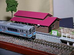 木崎湖畔にある木造の無人駅で「あがたの森文化会館」同様アニメ「おねがい☆ティーチャー」「おねがい☆ツインズ」に登場したことで知られ、ファンの来訪が絶えない駅です。こちらもアニメの影響で製作しました。 100円ショップで購入の模型展示用ケースをベースボードとし、建物は外壁と屋根の素材に「グリコ・ポッキー」「グリコ・プリッツ」の空き箱を使用。これはアニメの登場人物の好物に由来しています。 ※画像クリックで640x480サイズに拡大 |